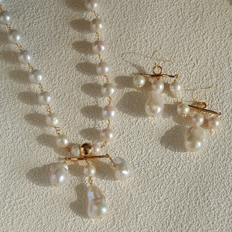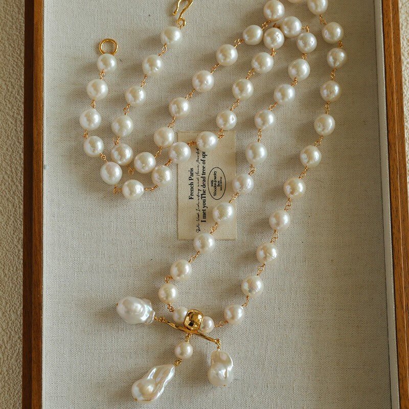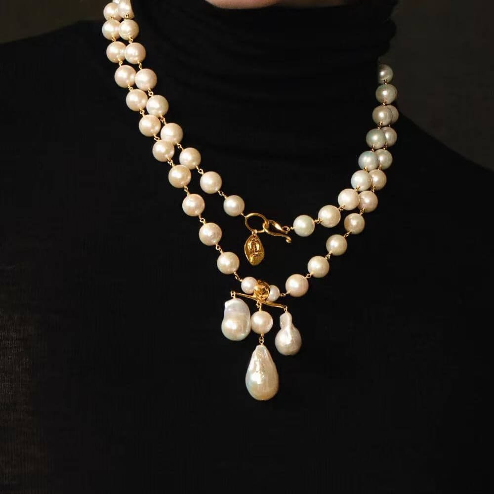 The Epitome of Vintage Grandeur Channel the bold elegance of 90s runway couture. This breathtaking Statement Collection is not for the faint of heart. Designed with a substantial, luxurious weight, it feels and drapes like a true piece of high-end vintage jewelry. The luminous, irregular freshwater Baroque pearls perfectly soften the bold 18K gold-plated hardware, creating a masterpiece of contrasting textures.
